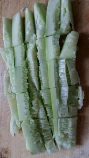 黄瓜去皮冲水,用刀拍碎切断,成一截一截的。