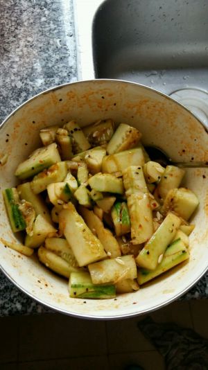 先放一些白糖(一小勺)把黄瓜拌一下,再将蒜,小米辣,四川辣油(因为之前用完了油,所以现在只剩渣了),酱油,醋,麻油一起倒进黄瓜里,翻拌均匀