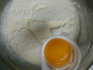 筛入低粉,正常不要放这么多,放再少点就好,也可以不放袄。翻拌匀,注意不要顺时间搅拌。放入一个鸡蛋黄,正常要放4个,没有鸡蛋能叫蛋挞嘛。可是老公不爱吃,我只针对这一款的做的袄。翻拌匀液体后放入炼乳在拌匀。