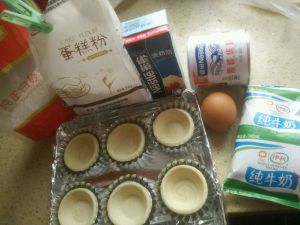 准备好原材料: 牛奶一盒250ml、鸡蛋4个(拍完照后增加了2个,忘拍了)、一勺白糖、蛋挞皮15-20个。