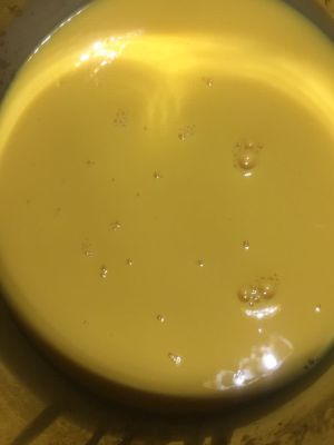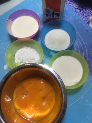 蛋清蛋黄分离(千万要分离的干净些,我基本已经分离不出蛋清了,可是烤的时候还是因为有一个蛋挞的蛋挞液里沾了一点点蛋清所以很快就烧焦黑了些,好在我闻到烧糊味及时用勺子把那点黑焦挖了出去就没事了。)