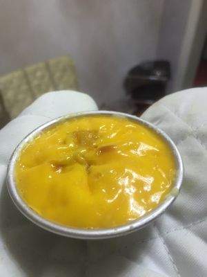 把面皮切小放到模具里面去,实验了好多次,最好的办法就是把面皮揉成圆形装到模具里面,用两手大拇指左右推拉使之成型,多出来的去掉便可…芒果切丁入模