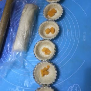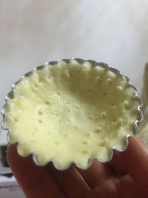 将图1的混合物用滤网过筛,之后将冷冻室内拿出的蛋挞皮放入烤盘中,每个蛋挞皮内倒入过筛的液体,8到9分满即可。