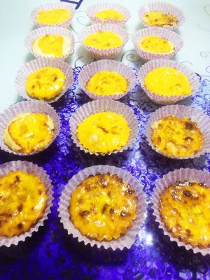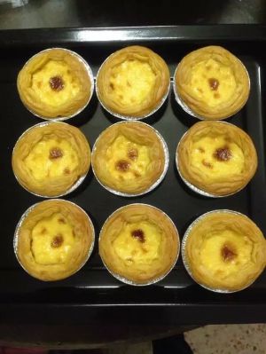 最后成品……偶也是第一次试做,查询了好几天,总结出来的一个方子,效果还行,达到蛋挞的效果了…geming尚未成功,同志仍需努力…烤的时候也在不断琢磨,最后加火加时间糖色出来效果好,也是慢慢琢磨出来的…喜欢做美食,喜欢美食,希望自己能在这条路上给自己爱的人、爱自己的人一些开心的动力,如此便好…