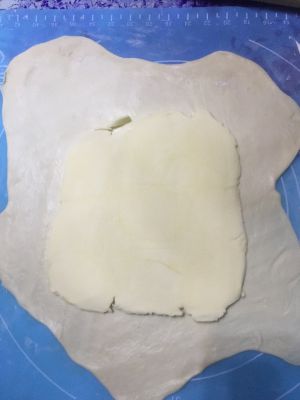 两个面皮,黄油往上,面皮包住黄油像军人叠被子,叠豆腐块那样包起来(底下面皮不要擀得太薄,适中就好,因为要同法擀三次,太薄第二次黄油就会跑出来,若面皮太稀揉的时候加点低筋面粉,稍微干一点会好一些)
