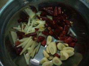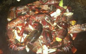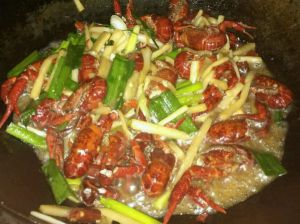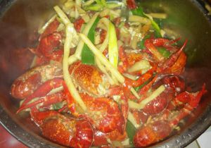姜丝、蒜头、辣椒下油锅炒香,下小龙虾翻炒!小龙虾变色下适量的盐,水闷煮。
