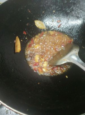 锅内剩余的油再次稍热,下豆瓣酱,烧菜料,姜,辣椒,蒜,葱,炒香