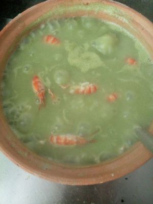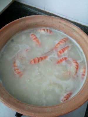 洗米放保加鱼杂汤加小龙虾猪一起煮