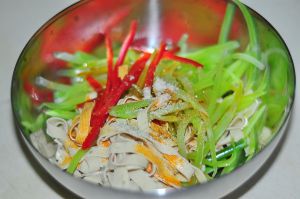 豆腐丝、莴笋丝、红椒丝放入碗里。