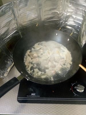 用大火煮沸后转至小火。放点姜片和盐。