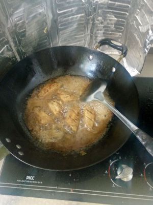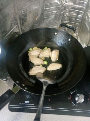 起油锅,加入姜片爆锅,鸡翅中放入两面稍煎成黄色。