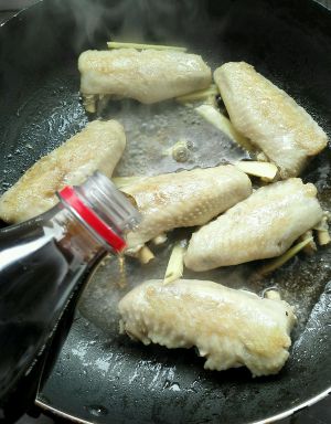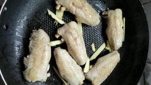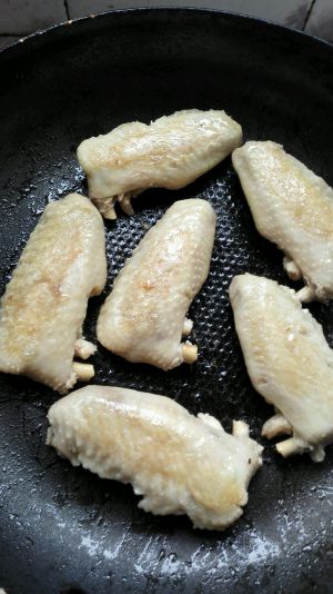 不粘锅烧热,转小火,鸡翅正面下锅,煎黄后翻面