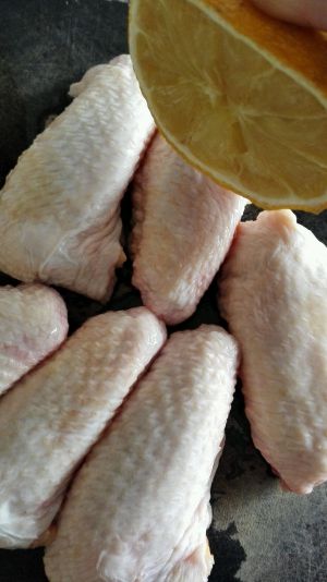鸡翅洗净沥水,柠檬挤出汁撒上