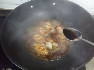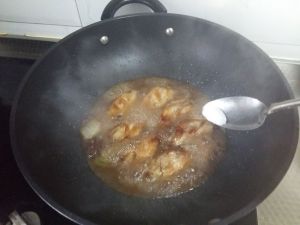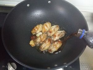 倒入可乐,可乐能将鸡翅盖住即可,可加入几滴老抽上色,盖上锅盖小火煮,最后大火收汁。