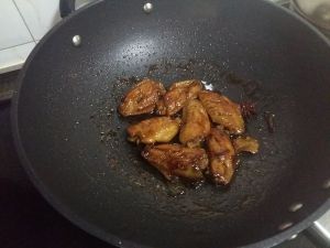 热油,下花椒粒,姜片炒香。倒入鸡翅翻炒,入料酒。炒到鸡肉发出香味,加入酱油,继续翻炒。