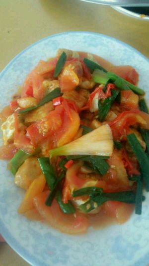 番茄下锅烧软,洒点水出汁加入煎好得豆腐入味,加盐,大葱,味精,收汁,装盘即可