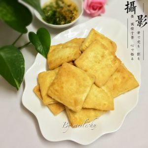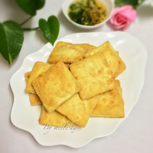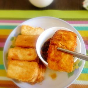热锅放多点油,煎豆腐才不粘锅,开小火慢煎,豆腐放入蛋液里过一下再入锅煎