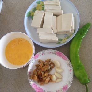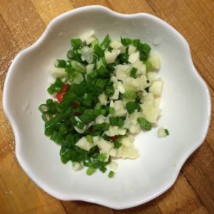 尖椒,榨菜,蒜头切碎,像这样子就好,夹豆腐吃才好吃