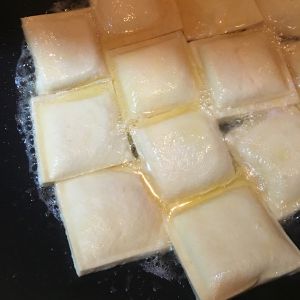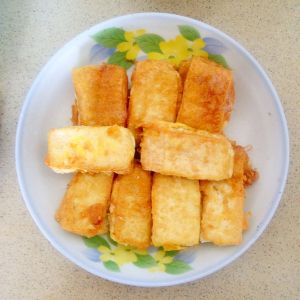 锅中加入油,大火烧热,放入裹了蛋液的豆腐中火煎至呈金黄色。