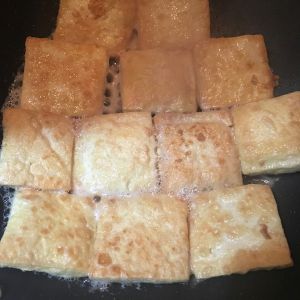 翻面,同样中火将豆腐煎至呈金黄色即可关火。