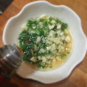 浇入热油,再倒入酱油搅拌均匀,蘸汁完成。