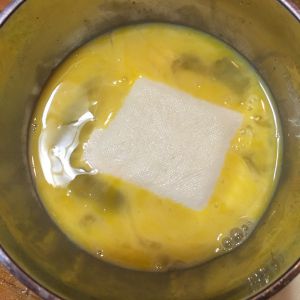 将切好的豆腐放入碗中均匀的裹上一层鸡蛋液。