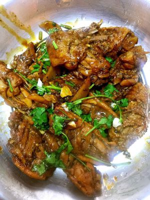 葱姜蒜爆香后,放入鸡翅煸炒片刻,加入酱油调色!