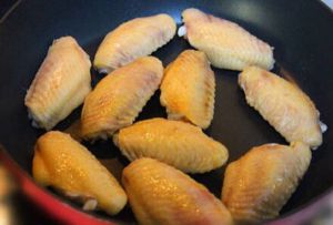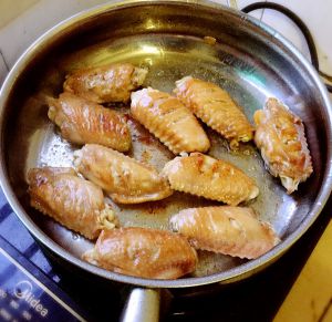 锅中放一点点油,然后将鸡翅放入锅中,小火煎至金黄