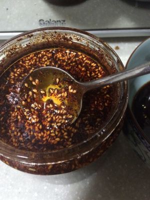 在这再费几句话,就是关于辣椒油的,这是我的得意之作,不是传统的油泼辣子,我觉得那样很容易糊,我做的时候是凉锅把辣椒粉放入炒锅,然后点火,焙一下水分,然后放入植物油,油冒泡的时侯放进一些白芝麻,就可以盛出来了,超级香,而且不会糊,放到密封罐子里,拌凉菜、调味都蛮不错