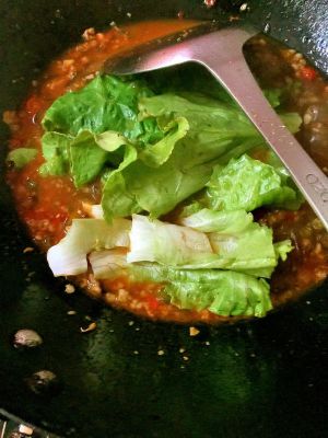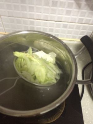 西生菜撕条,也用网勺放到煮粉的锅里,烫两下就熟了,千万不要煮太久,不然就不好吃了