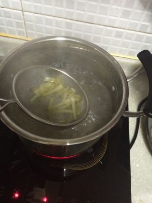 榨菜切小条,用网勺放到煮粉的锅里,去去咸味,因为榨菜真的好咸