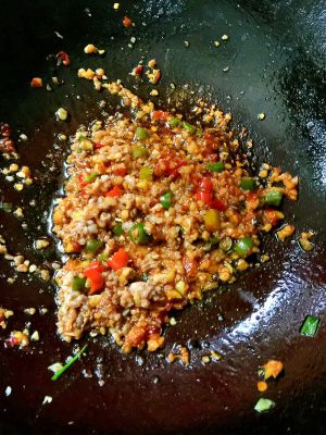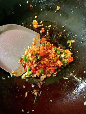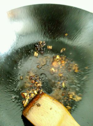 将切好的蒜末,姜末,火腿肠末,花椒过一遍油,爆出香味
