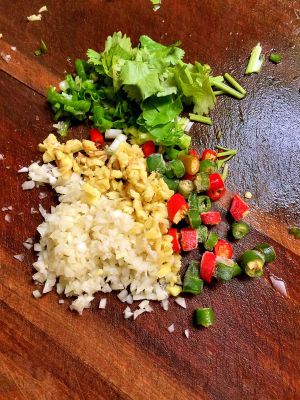 备好佐料,将蒜和姜剁成末,小尖椒、香菜、葱切成段。
