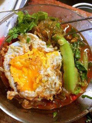 在调料中加入面汤,红薯粉,再加入炸好的蒜末等。放入煎蛋,酸辣粉丝成型!