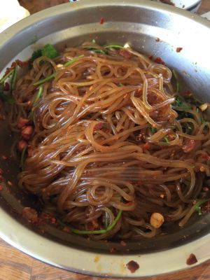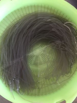 香葱、香菜、花生、榨菜切碎备用,粉条用清水泡30分钟。