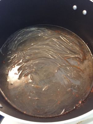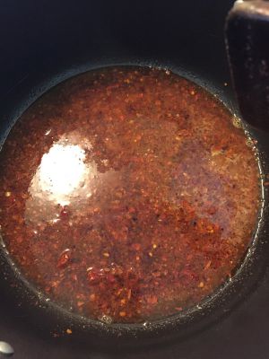 锅中倒油,将花椒炸过一次后滤掉,放入辣椒和辣椒面,用小火将其炒香后加入开水,熬一会后盛出到之前的调味碗中。