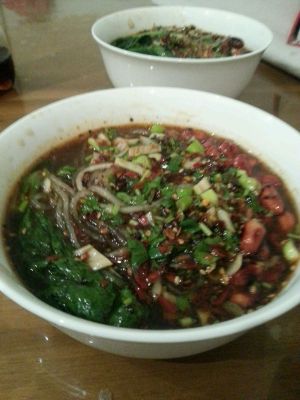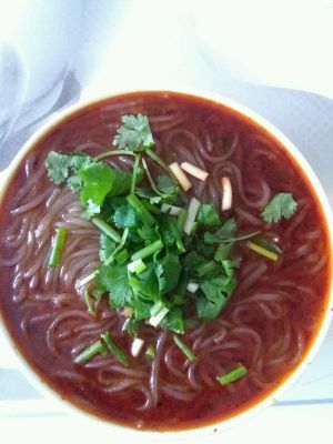 粉煮成自己喜欢的软硬程度就可以出锅啦,盛入之前填好汁的碗中就ok,然后码上所有的配菜,准备开动吧~~