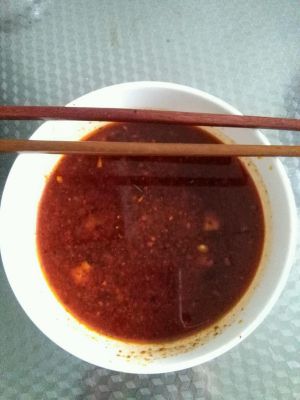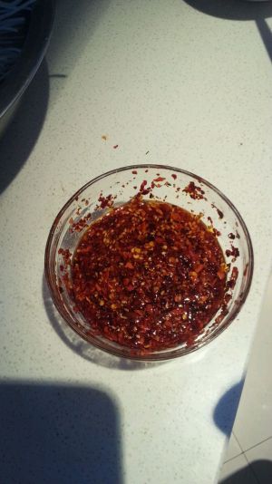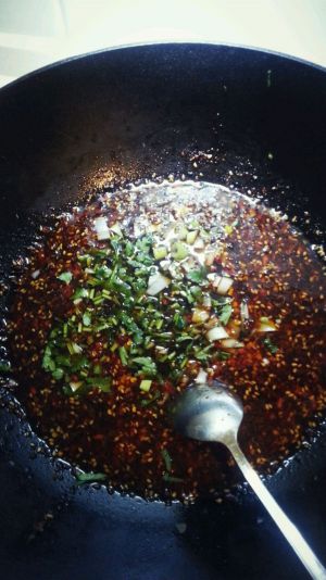 家里要先准备一碗油辣子,也就是辣椒油,这个是自制的,就是把大葱花椒丢热油里炸至飘香,用漏勺滤出,分三次倒入盛有辣椒粉的碗里,并快速搅拌即可。