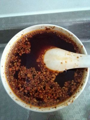 按照配料表放入油辣子,蒜头碎,酱油,香醋,胡椒粉,花椒粉,糖,倒入适量开水,尝尝味道咸淡,并根据个人口味调配。