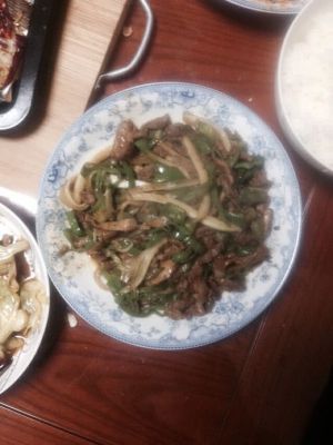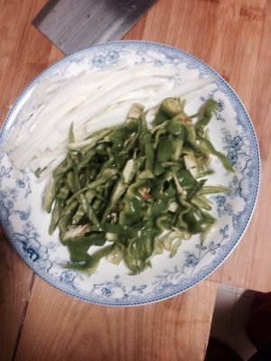 青椒切丝,大葱切丝,姜切丝备用,肉洗净后加入姜、葱、酱油,料酒腌制十分钟