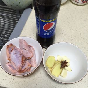 油烧热,八角爆出香味 油锅里鸡翅两面煎至变色 加入适量生抽、可乐、生姜