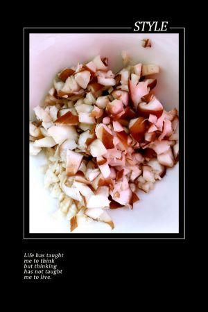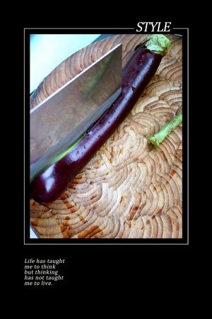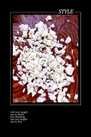 茄子洗净切滚刀块或菱格花纹块,我今天演示的前者。姜蒜随便切碎。