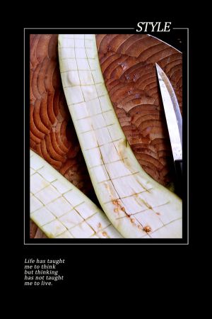 备料:1.喂肉馅:放葱末,姜末,酱油,耗油,水,顺时针搅拌! 2.茄子洗净,先横着切片不断刀(可以用筷子把茄子当着切就不会切断了)在反过来斜着切。就是图片效果了!嘻嘻很简单哦!我也是第一次切哈 3.葱姜蒜切碎备用