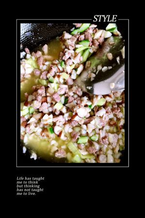 锅内余油,大火,姜蒜爆香,下肉末炒散。