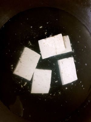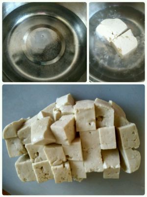 锅里盛水加入一匙盐烧开,将豆腐放入开水煮2分钟,盛出切小块备用