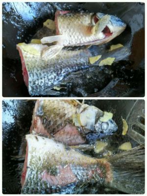 把鱼洗净之后加入适量的油热锅.当油有点热的时候就可以放鱼了,由于我没有等鱼放干就煎所以皮都掉了.