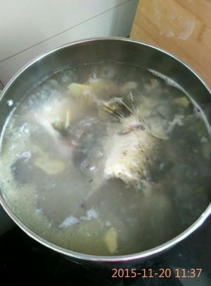 将煎好的鲫鱼与姜片盛入备好的开水锅中,使终保持大火状态,将鲫鱼汤熬成白色,这个过程大约需要20分钟左右