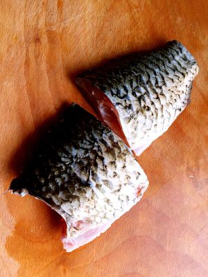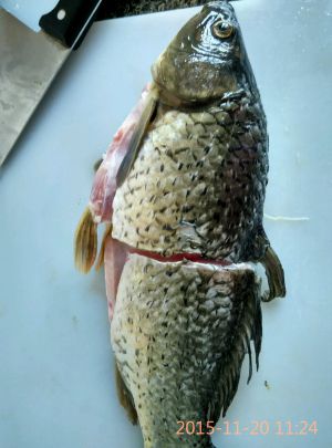 鲜活鲫鱼去头去尾去内脏,清洗干净,切成两块儿
