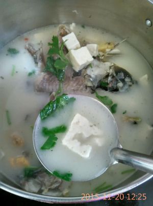 我煲了90分钟,鱼汤很浓白了,加入汆好的豆腐,先开大火烧开,然后转小火炖,炖至豆腐表面出蜂窝状才好