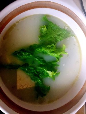 洗两叶小生菜放入,加盐调味关火。也可加金针菇、口蘑,我因外面下雨,很懒得出去买,就这样亦是非常鲜美。